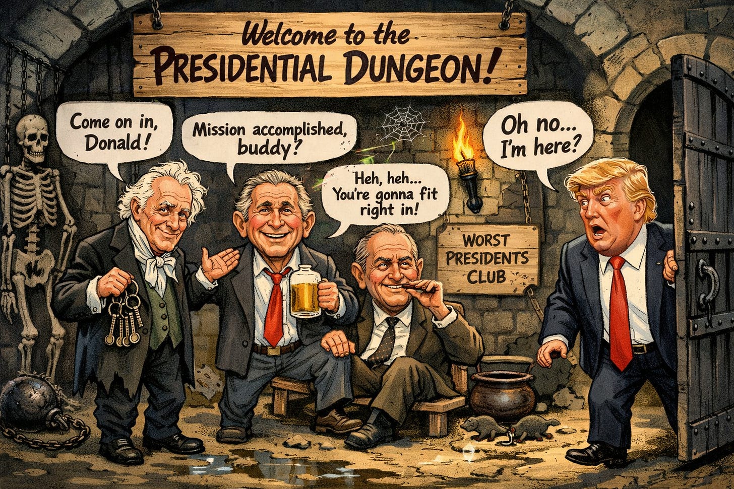 I avoid using the term “great” in my personal classifications. I note a handful of the usual Exceptional Presidents, followed by a few Above Average Presidents, a broad expanse of Mediocre Presidents, some Poor Presidents, and then those who are simply The Worst. My criteria for placing any one of them in the Presidential Dungeon leans heavily on my antiwar sensibilities: those presidents who, either by their actions or inactions, have unleashed generational death and destruction, bringing harm to ourselves and others. In short, these are the Presidents who have the most blood on their hands.