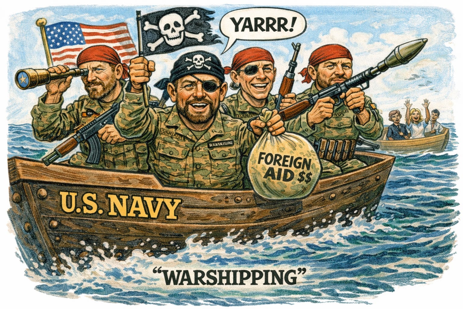 Of course, we do seem to have a lot on our plate beyond mere piracy: the Greenland gambit (remember that?), our ongoing (?) take-over of Venezuela, and our intention to starve Cuba into submission (with Russia and China committed to support their ally of 65 years standing)--and that is just in this hemisphere. We are also currently waging (and losing) a hot war against Russia using Ukrainians as cannon fodder. Meanwhile, a third of our fleet is massing in the Persian Gulf for a strike against a country that poses no threat to us, ahem. Again, Russia and China are on board to support their neighbor and ally. Meanwhile, sanctions are served-up for everyone!