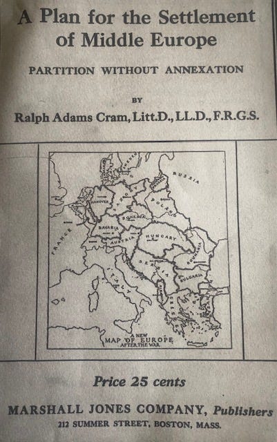 Cram wrote Walled Towns in September, 1919. The war had been won, but the shape of the world to be was still in flux. Not content with cataloging the destruction, Cram actually charts a way forward, or as he puts it, a “way out.” He was not short of ideas on exactly what should be done with Europe. In late 1918 he published A Plan for the Settlement of Middle Europe: Partition without Annexation. He prepared a fascinating map, far more informed than the one President Wilson sketched on a map of Europe unrolled upon a floor in the Palace of Versailles. Cram’s was not a hard and fast proposal, the accompanying essay allowed for plebiscites and adjustments as needed. I found it breath-taking in its groundedness to the actual history of Europe, as opposed to the ideology of Wilson and the avariciousness of the British and French.