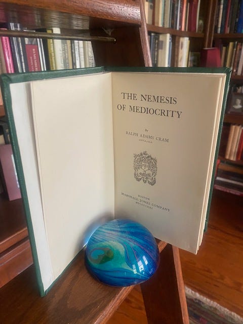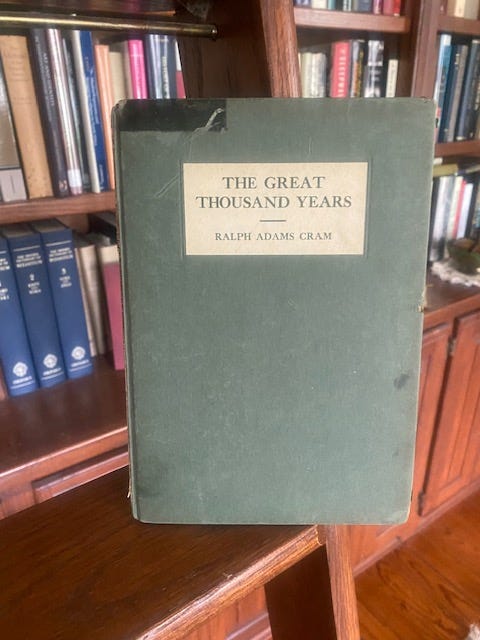 One pleasure of living with books is the discovery of neglected writers whose voices ring with clarity down through the ages. Ralph Adams Cram (1863-1942) is just that sort of author for me. His scholary dissertations on history form one third of triumvirate of wisdom for me: the others being Welsh author Arthur Machen (1863-1947), who could summon up the transcendent and the strange, and his younger compatriot, Edwin Greenwood (1895-1939), a master of broad humor. All three of these men were kindred spirits, and I would like to think that the two English friends were familiar with Cram’s work, and visa versa. For them, Modernity, erected on a foundation of industrialism, consumerism, and materialism, was a complete sham, full of hypocritical pretense and hollow rhetoric about progress, democracy and the Rights of Man. They also had a good idea of what was coming and why.