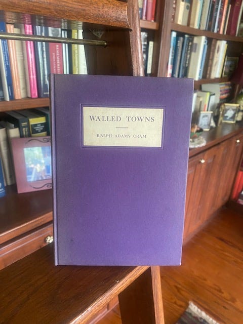 Cram begins Walled Towns with a description of a walled city in western Europe where “there is no smoke and no noxious gas…no sounds but human sounds…no slums and no suburbs and no mills and no railway yards…colour everywhere, in the fresh country, in the carven houses, in gilded shrines and flapping banners, in the clothes of people like a covey of varicoloured tropical birds…no din of noise, no pall of smoke, but fresh air blowing within the city and without, even through the narrow streets, none too clean at best, but cleaner far than they were to be thereafter and for many long centuries to come.”